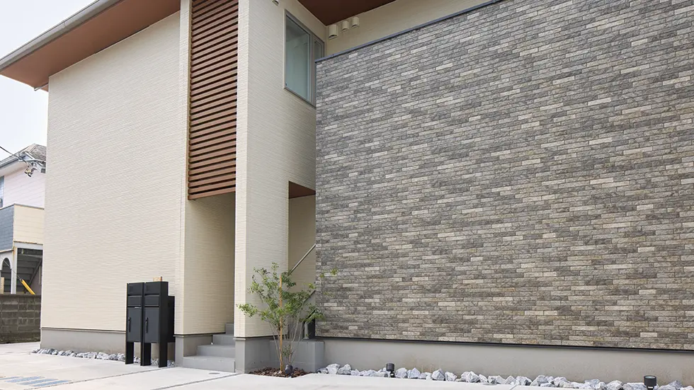 外に閉じ中に開くL字型住宅の外観には、ベース柄にエコルセ、アクセントにグラナダストーン調を採用。 Fu-geによる左右接合部にシーリング目地の入らない一体感のある壁面が、外壁の美しさを際立たせています。 また、軒天材の木目調、軒天と同系色のルーバーを用いて、全体的にアースカラーとナチュラルな質感で統一感を図る ことにより、より一層ランクアップしたファサードに仕上がりました。
