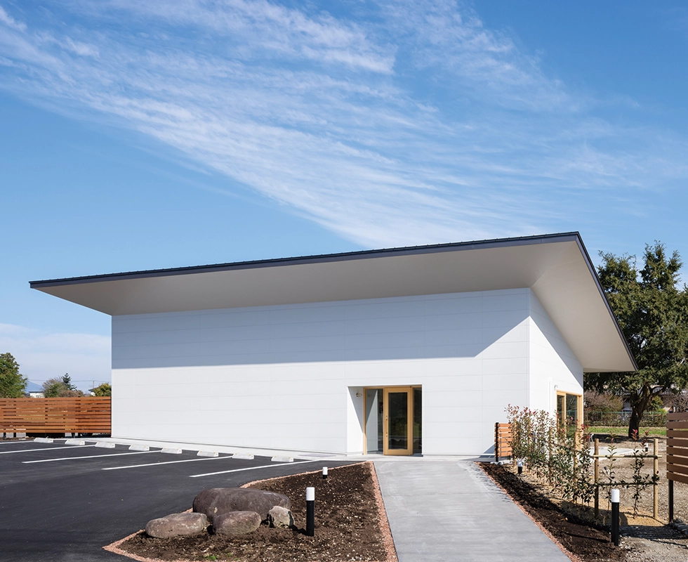 那須塩原の「牧歌的な」風景に計画のペットコテージ、つまりペットと泊まれる宿舎である。大屋根軒下の余白のような壁にはフラットウォールが選ばれているが、その壁に余白のように希薄な風合いをもたらすために、目地割や出隅、屋根と巾木との接合部には細心の注意が払われている。総じて牧歌的であることがとてもいい。