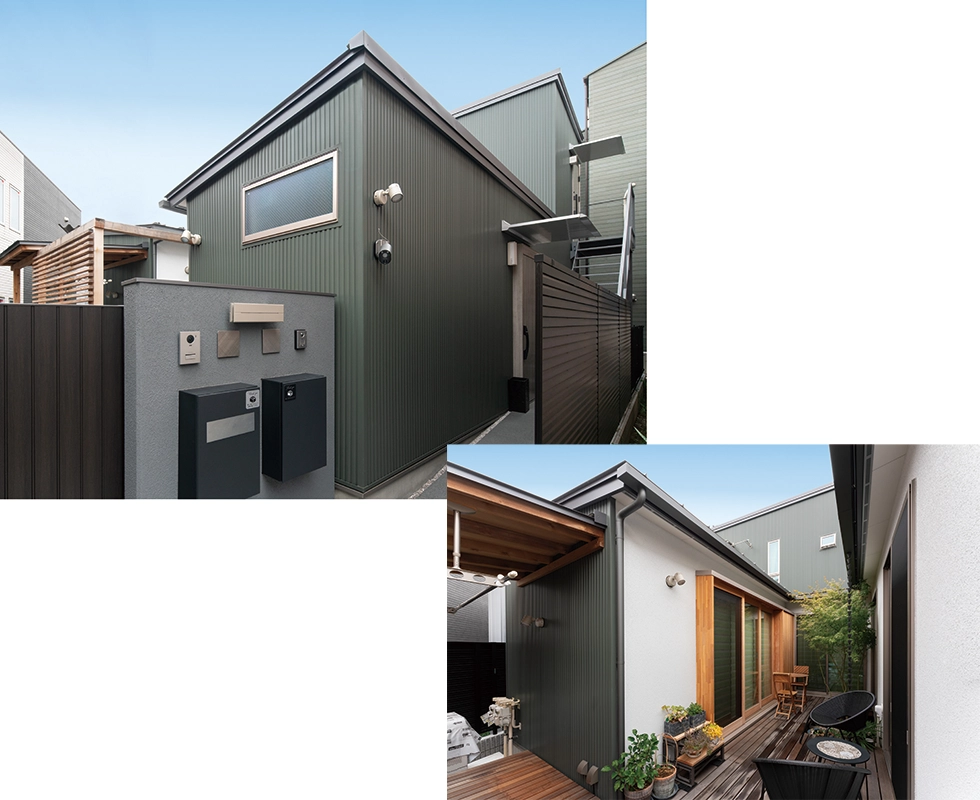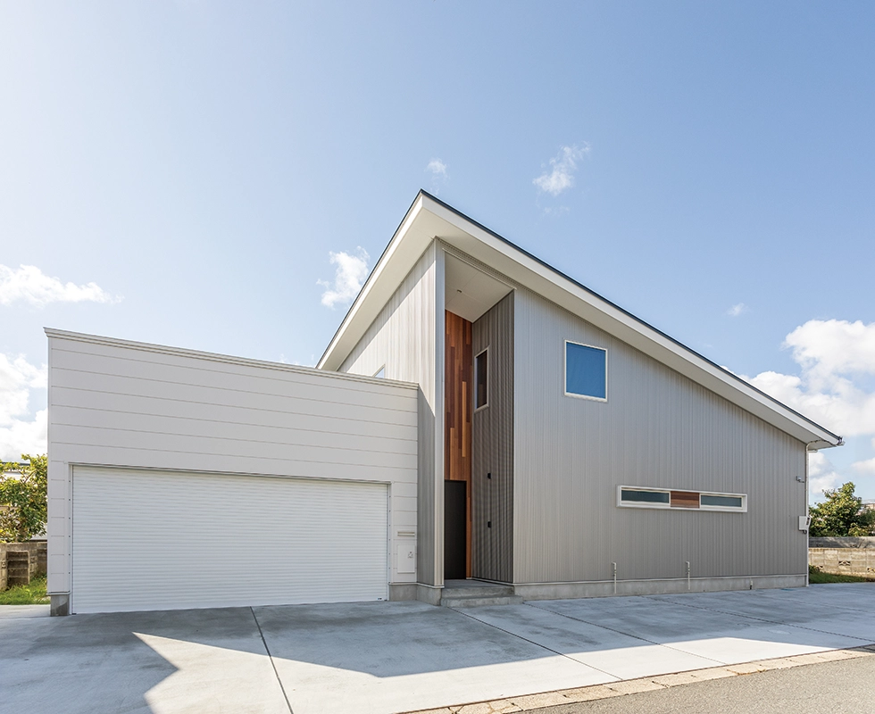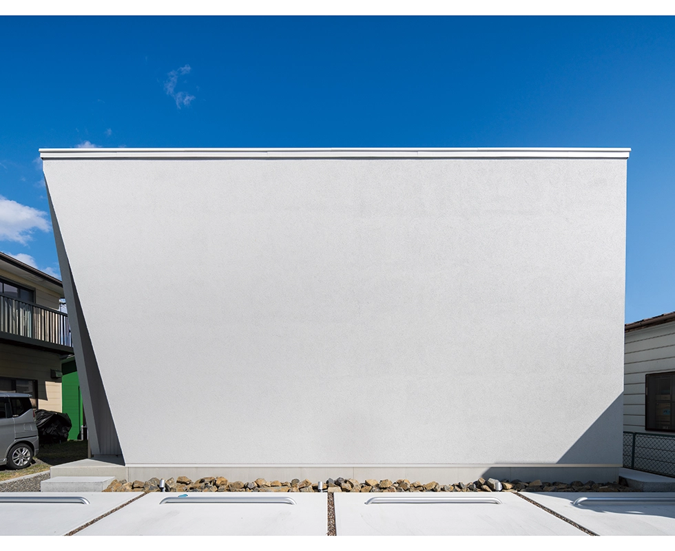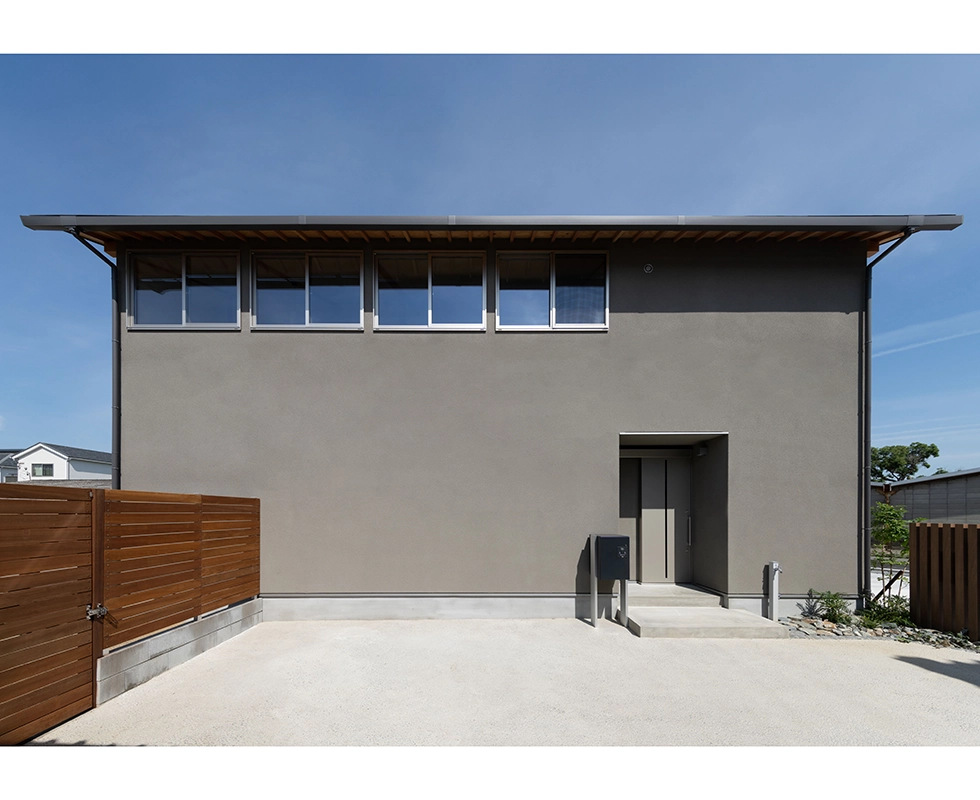 丹念なディテールの追求が豊かな全体像を生成する、建築アプローチのお手本のような住宅建築である。フラットな表面性を生かした壁の起伏、同色の雨樋、えぐられるような木質の軒、そのようなディテール集積がFu-geの製品特性を生かす好例といえよう。