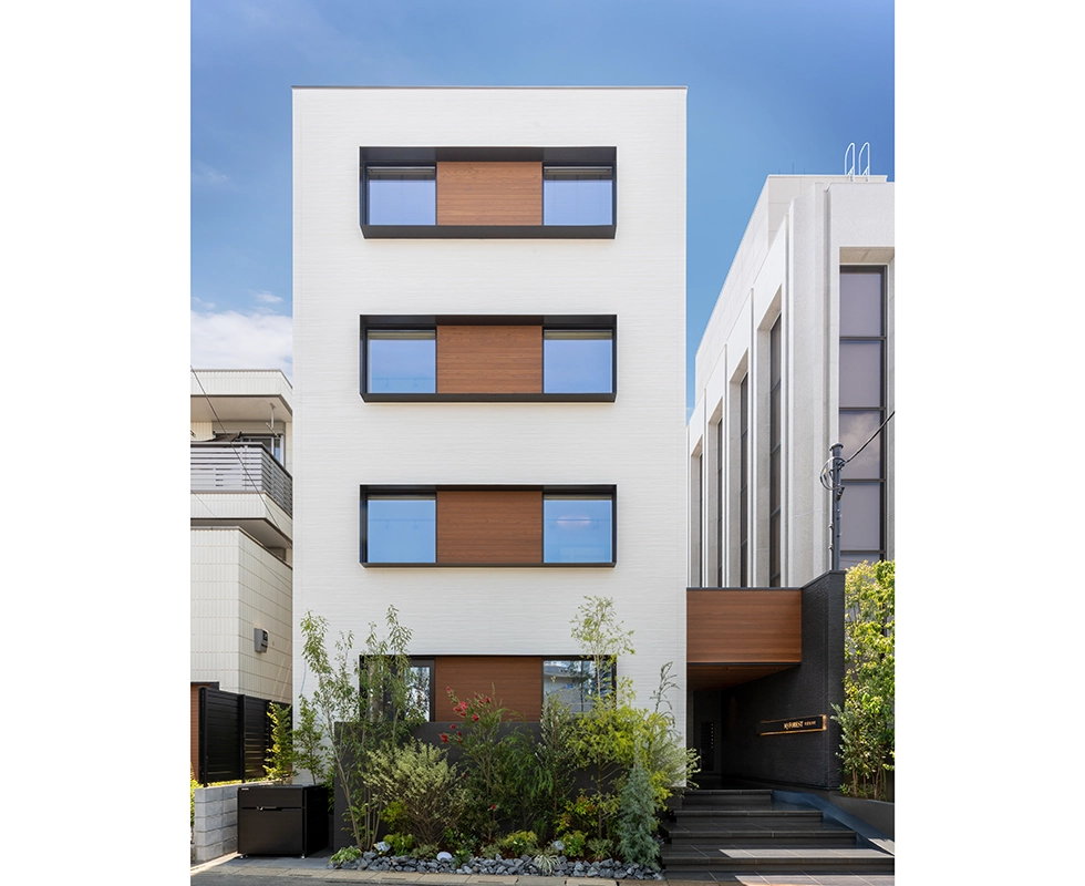 中層賃貸マンションでRCと木造(上層4層)のハイブリッド構造であり、耐火性能を求められるサイディングの採用としても興味深い案件である。バルコニーデザイン手法の工夫として、ヴィンテージウッドを使ったアトランダムグリッドデザインが動的な外観を生んでおり、街並みのサーフェイスのボトムアップに貢献している。