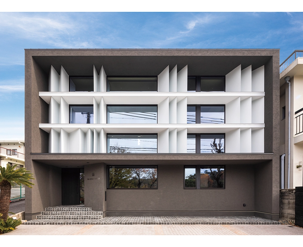 S造4階建ての集合住宅であり、バルコニーがファサードとなるしか無い条件である。バルコニーの形を横ストライプと断定する手法も多くあるので、特別なことは何も無い。そんな条件下で異なる色の左右ブロックのいきなりの接合である。ミニマルアートの彫刻のようでもあり、潔い風合いを生み出した。