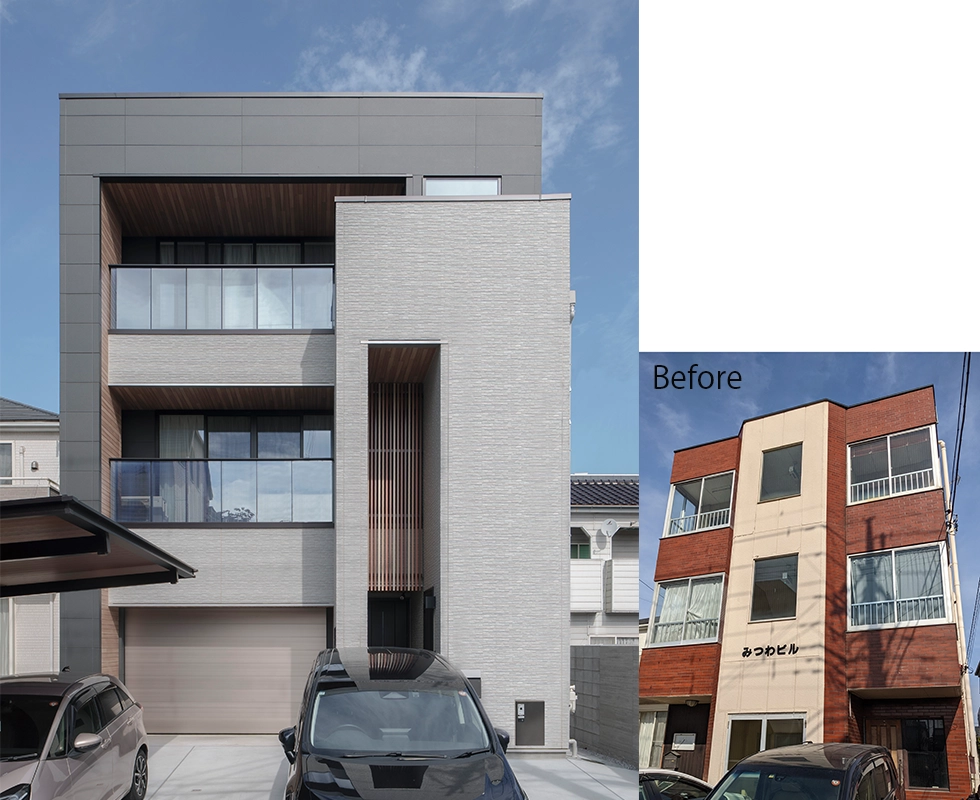 リフォームの概念を突き破るリフォームである。以前の面影が一掃される「新築」のカバーリングであり、深みを帯びた建築への変容となっている。ビルから住宅へのリフォームとしても評価した。