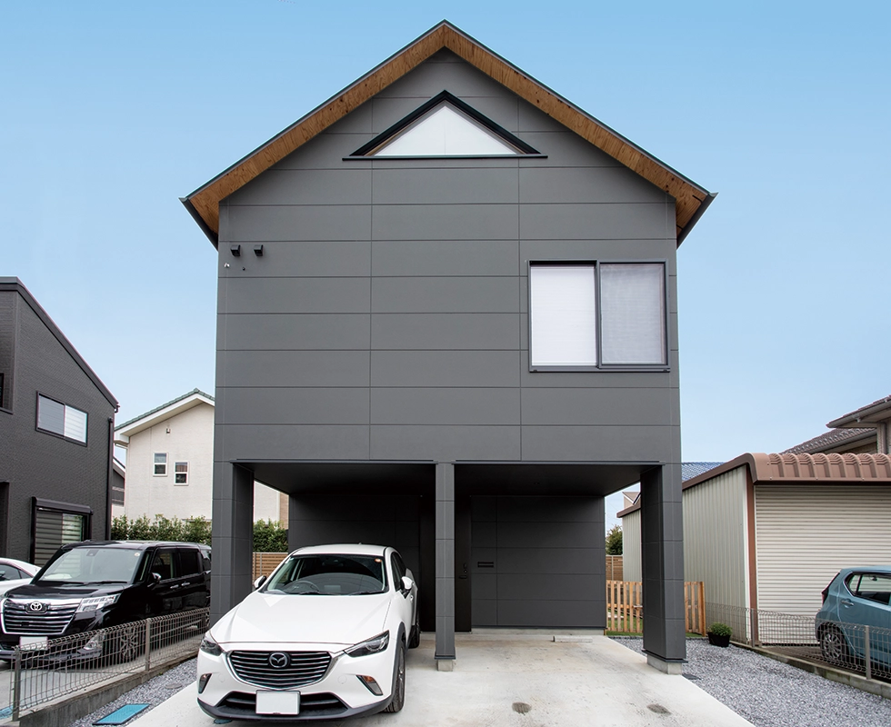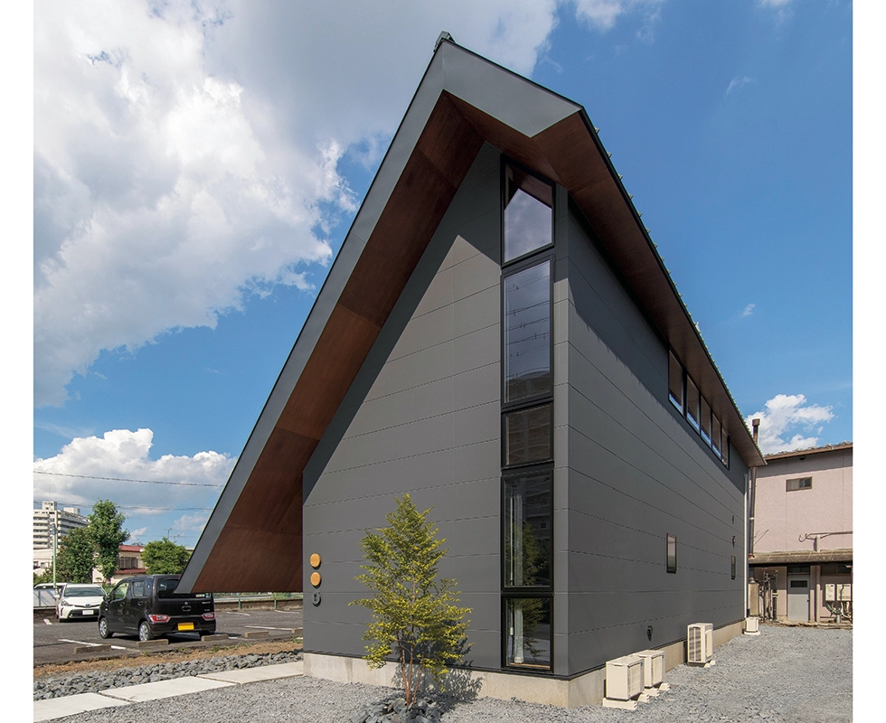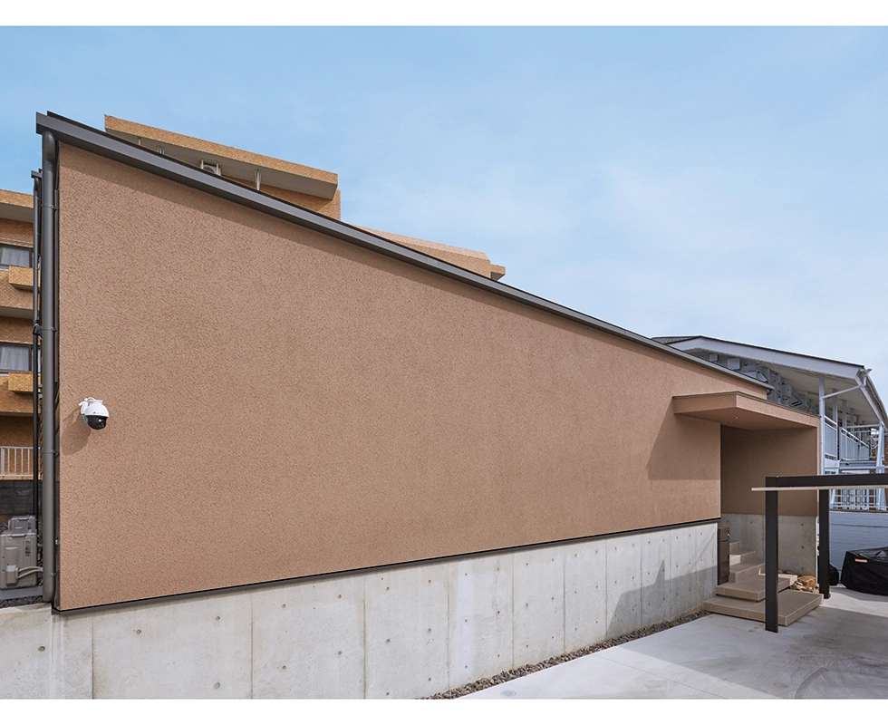丹念なディテールの追求が豊かな全体像を生成する、建築アプローチのお手本のような住宅建築である。フラットな表面性を生かした壁の起伏、同色の雨樋、えぐられるような木質の軒、そのようなディテール集積がFu-geの製品特性を生かす好例といえよう。