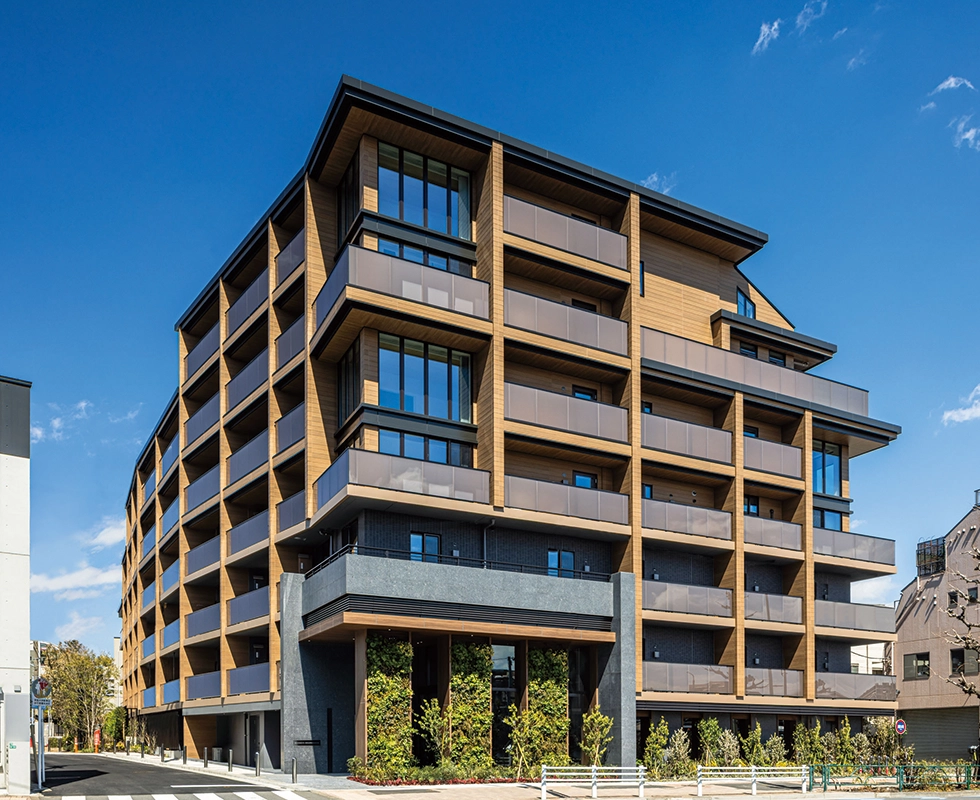 中層賃貸マンションでRCと木造(上層4層)のハイブリッド構造であり、耐火性能を求められるサイディングの採用としても興味深い案件である。バルコニーデザイン手法の工夫として、ヴィンテージウッドを使ったアトランダムグリッドデザインが動的な外観を生んでおり、街並みのサーフェイスのボトムアップに貢献している。