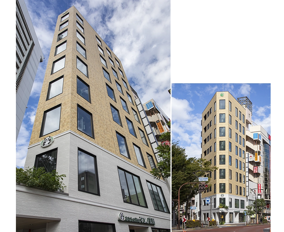 鉄骨造の中層ビルへのサイディング採用は、新たな提案が待たれる。9階建てのビルともなると、サイディングのマテリアルの印象が変化するからである。この建物でも大きな壁面のインパクト確保に苦労したという。シンプルなポツ窓の収まりや下層階の柱の出隅などに留意し、外観の存在感を確保した点を評価したい。