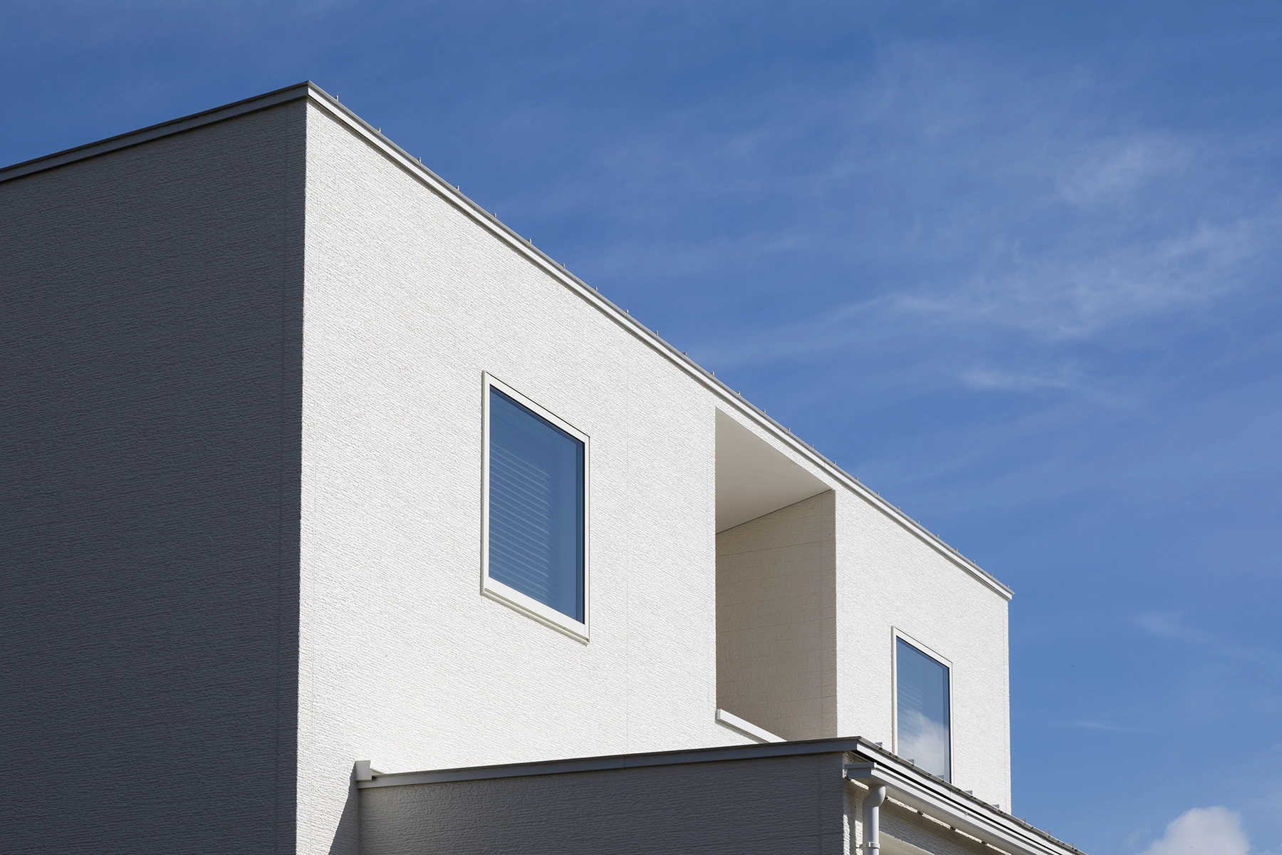 職人技で仕上げたような、こまやかな素材感がゆったりと上質な印象を醸し出すしぶきVを全面張りで用いています。上下のつなぎ目が目立ちにくい一体感のある美しい壁面がより一層、一般の住宅とは異なり、一線を画しています。開口部の大きさや配置、庇の厚み、夜間の照明計画など、外観への配慮が細部まで行き届いています。